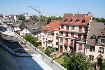 Dans un quartier dominé par des villas 1900 de quelques étages, le 10 rue Daniel Hirtz offre une présence marquante à la fois par son inspiration Art nouveau et sa forme en "fer à repasser". Le soleil est toujours présent côté cour, la matin côté Est, et l'après-midi côté Ouest, et le parc de l'Orangerie et le Jardin botanique universitaire procurent deux lieux de promenade verts.